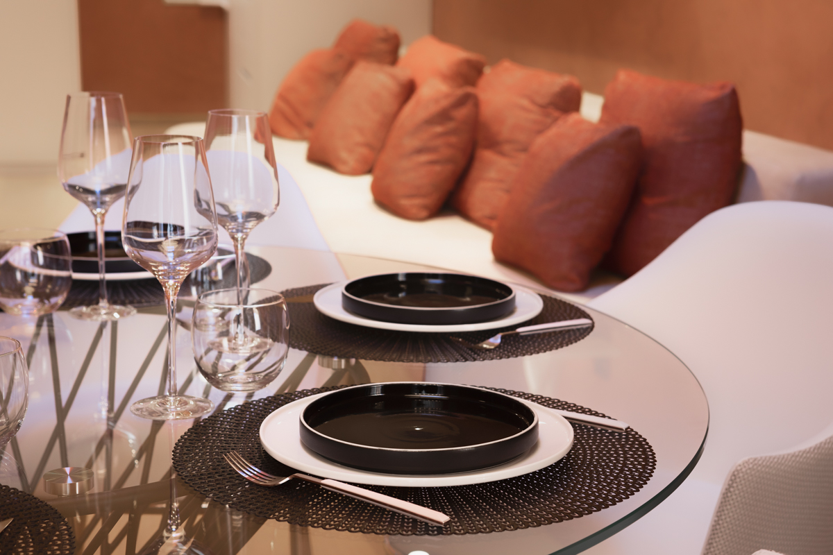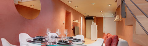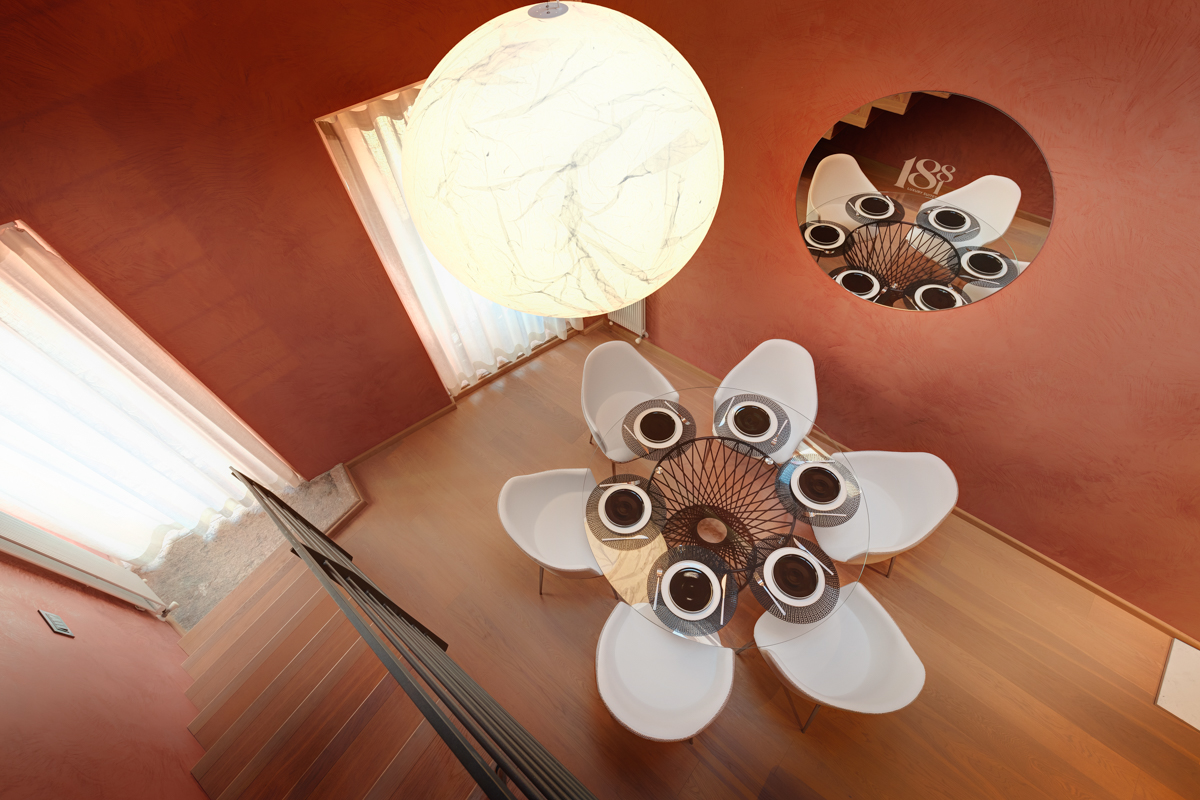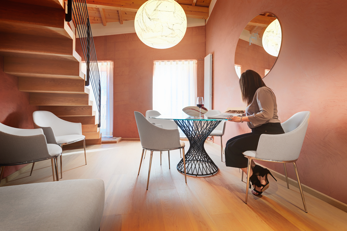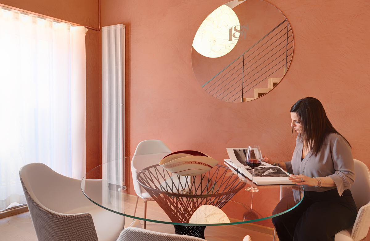 Nel salotto di questa suggestiva Suite troverai un grandissimo divano con morbidi cuscini dalle tonalità calde del rosso-arancione e un tavolo rotondo in vetro con sei poltroncine - sei come il numero di ospiti che i 100 mq di MO·ON possono ospitare.