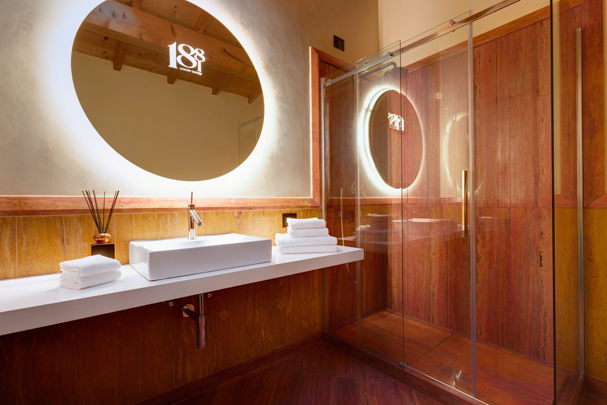 Il bagno in marmo veronese si trova tra due camere da letto ed è caratterizzato da una doccia dello stesso materiale, uno specchio rotondo che riporta il logo 1881 Luxury Suites e un soffitto con travi in legno che trasmette calore all’intero ambiente.