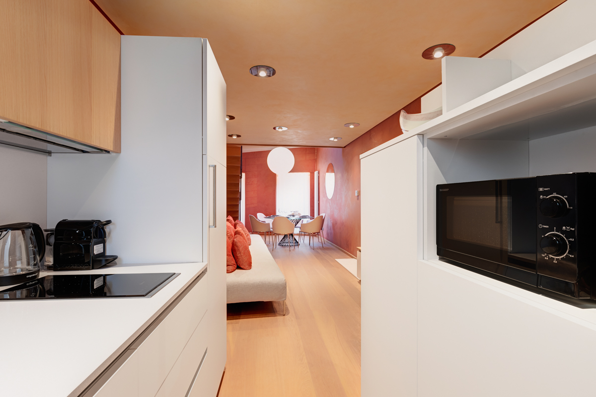 La Suite è avvolta dalla luce naturale che filtra dalla finestra della cucina - dotata di ogni comfort, come fornelli a induzione e lavastoviglie - e dalle due finestre del soggiorno.